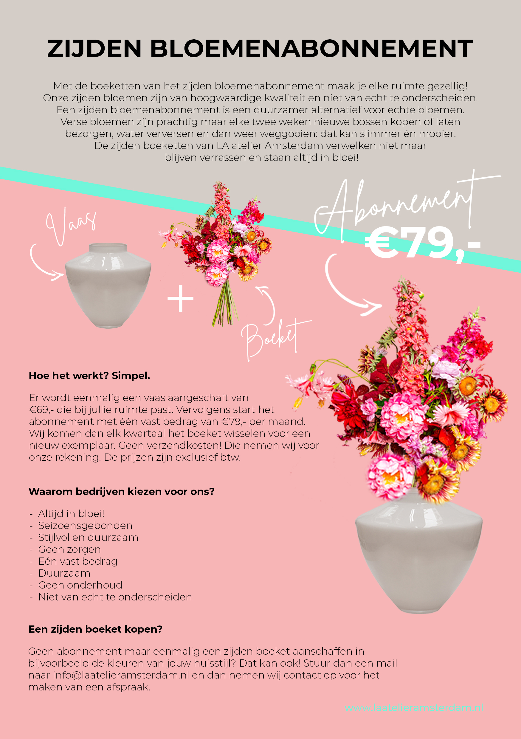 Leuk dat je overweegt om een zijden bloemenabonnement af te nemen bij LA atelier Amsterdam. Onze zijden bloemen zijn een duurzamer alternatief voor echte bloemen én maak je elke ruimte weer voor iedereen gezellig!